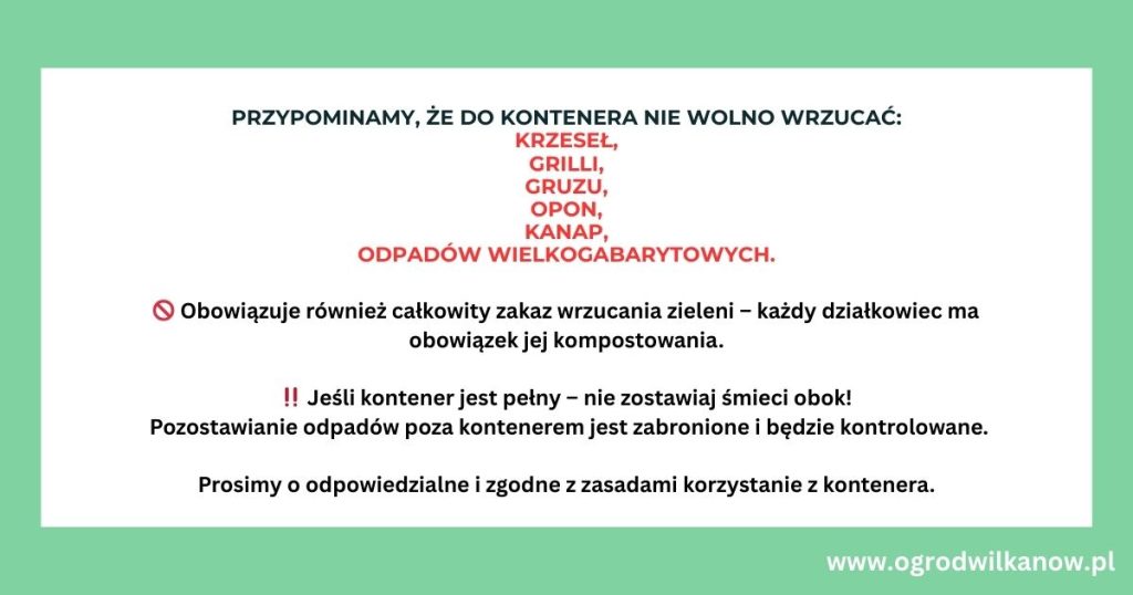Obowiązuje również całkowity zakaz wrzucania zieleni – każdy działkowiec ma obowiązek jej kompostowania.Jeśli kontener jest pełny – nie zostawiaj śmieci obok!